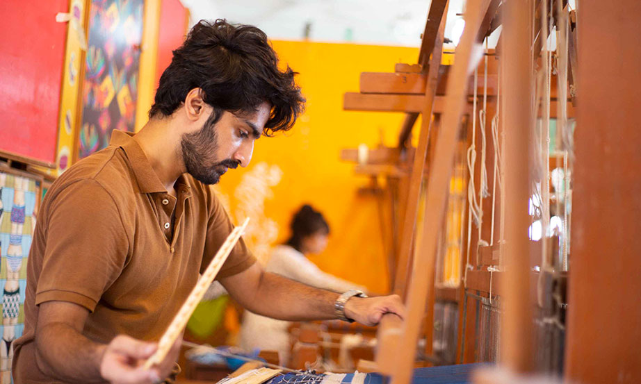 This course focuses on the basic principles of fabric construction. In the third and fourth semesters, students are introduced to loom functionality, starting from warping, heddling, reeding, and weaving. The recognition of diverse thread counts and basic to advanced weave structures are taught through graphs and wrappings. In the fifth semester, students work with existing woven fabric collected from the market and analyse weave structures. This fabric analysis helps construct variations of the weave patterns. Woven fabric samples are produced for either apparel or upholstery, ready to be adapted for industrial use. They apply acquired skills and further develop their weaving portfolio, with emphasis on colour and construction. Products are made according to market specifications. Digital technology has a significant impact on practice and is seen prominently in strategies of practical application of theory. Students work with Adobe Design Suite to design and create artworks with technical specifications. The objective is for students to achieve confidence when designing woven materials for home and apparel.